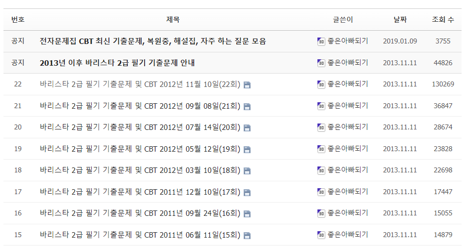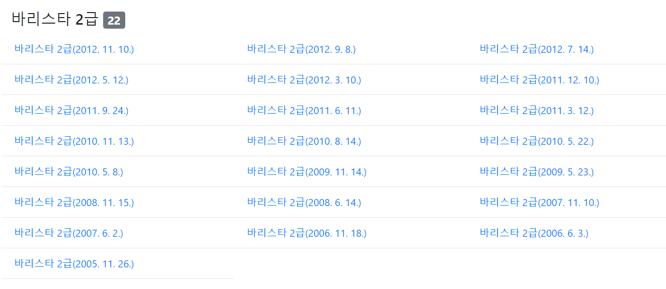 검색어에 원하는 자격정보인 바리스타를 검색하시면 바리스타 2급 관련 기출문제 목록을 확인하실 수 있습니다.