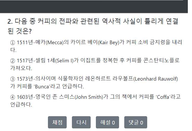 이 사이트를 통해 바리스타 2급 자격증을 포함한 여러 자격증 관련 기출문제를 확인하실 수 있습니다.