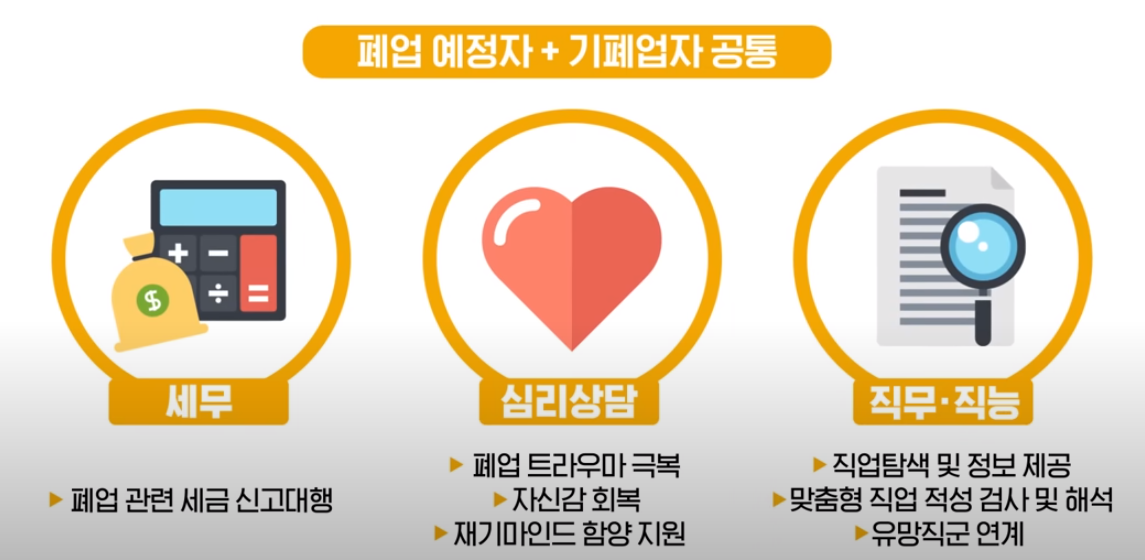 폐업 예정자와 기폐업자 공통으로 세무와 심리상담, 직무직능 등의 항목을 지원받으 실 수 있습니다.