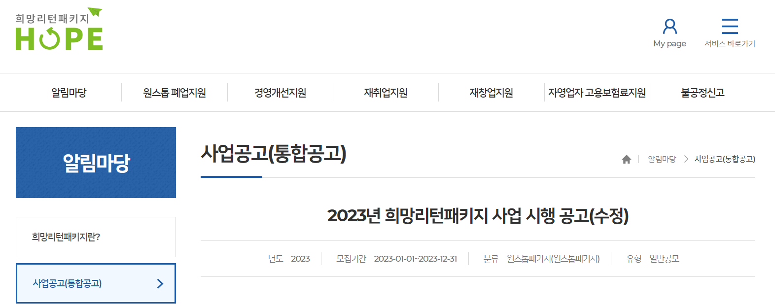 소상공인 폐업지원금 신청을 바로 먼저 진행하고 싶으신 분들은 희망리턴패키지 홈페이지로 바로 가신 후 신청해 주셔도 됩니다.