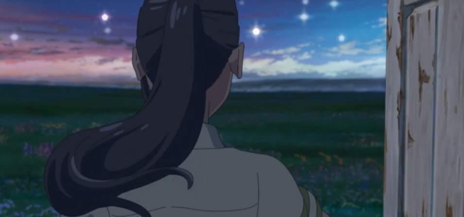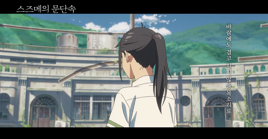 스즈메는 초원속 폐허를 돌아다니며 어머니를 찾는 어린 시절의 스즈메를 보여주며 영화가 시작됩니다. 잠에선 깬 스즈메는 일찍이 어머니를 여의고 미혼인 이모와 함께 살고 있는 간호사 지망생으로 비칩니다.
